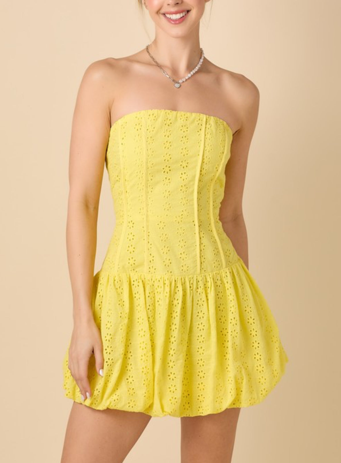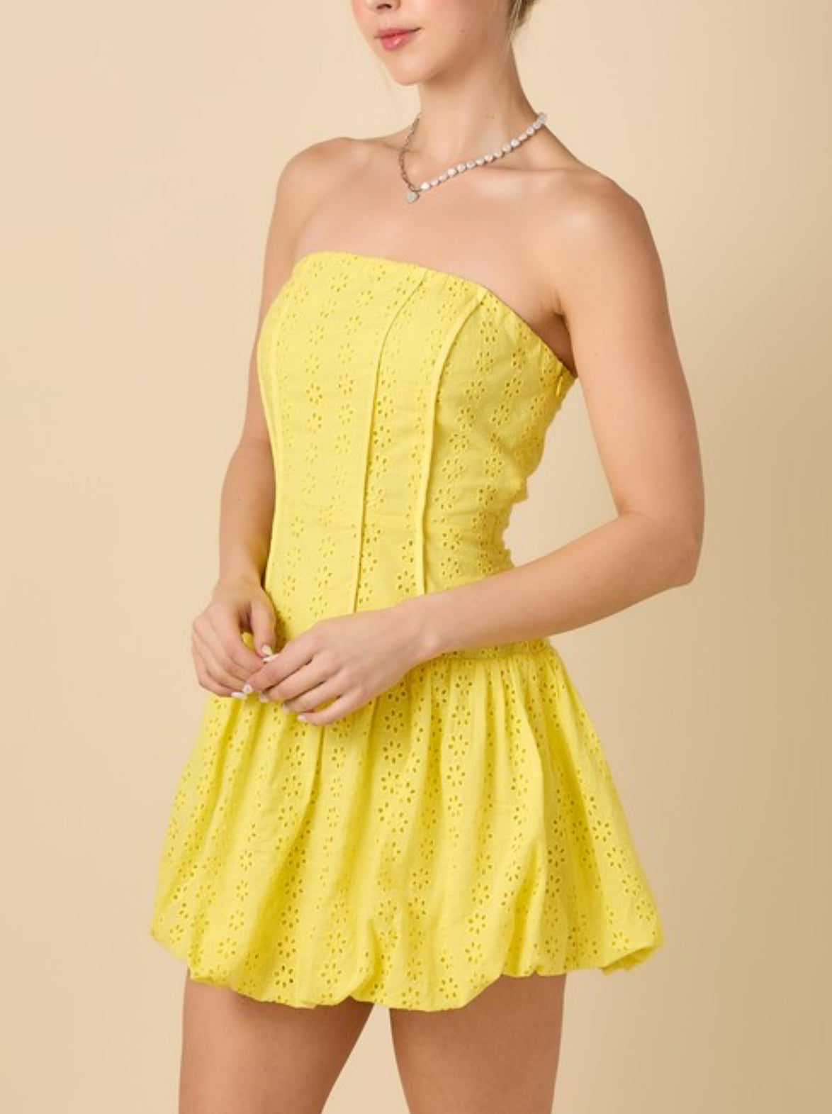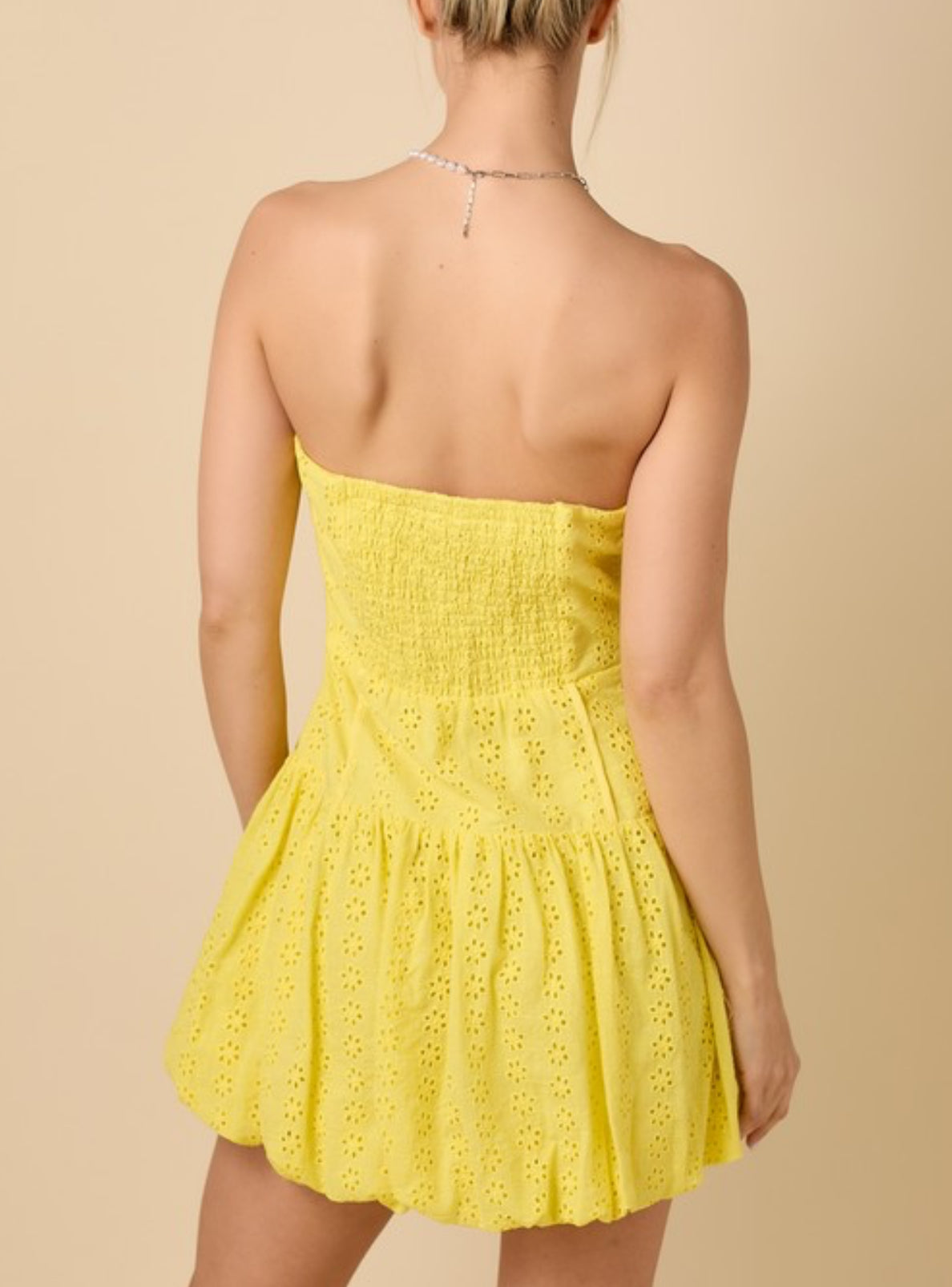 This strapless yellow mini dress features delicate eyelet embroidery, a flattering fitted bodice, and a bubble skirt that brings just the right amount of volume. The tube style neckline keeps it modern, while the bold color is a seasonal must have. Sunny, playful, and impossible to miss.