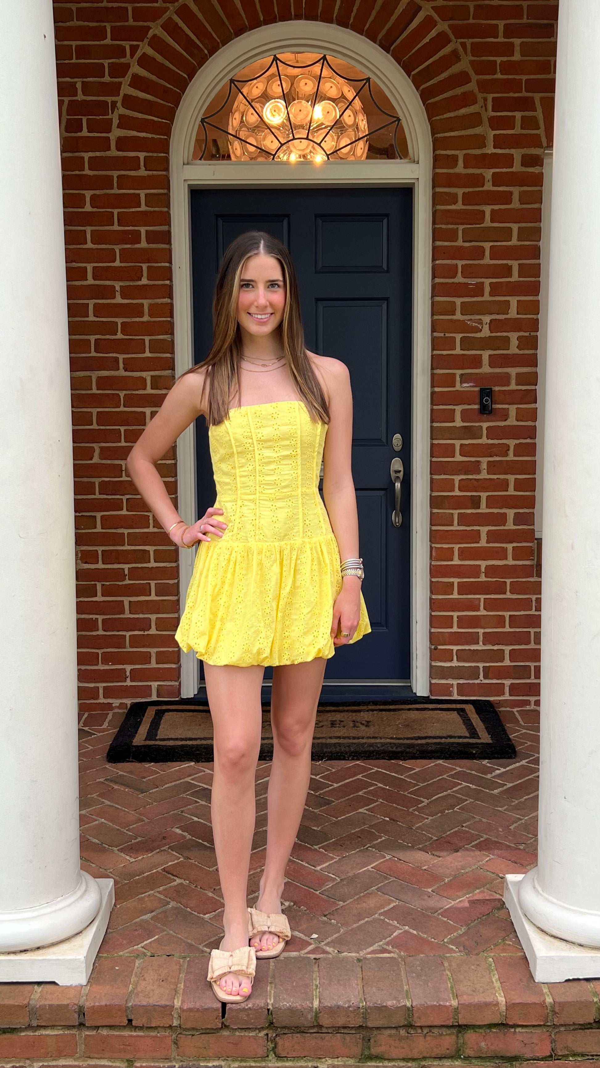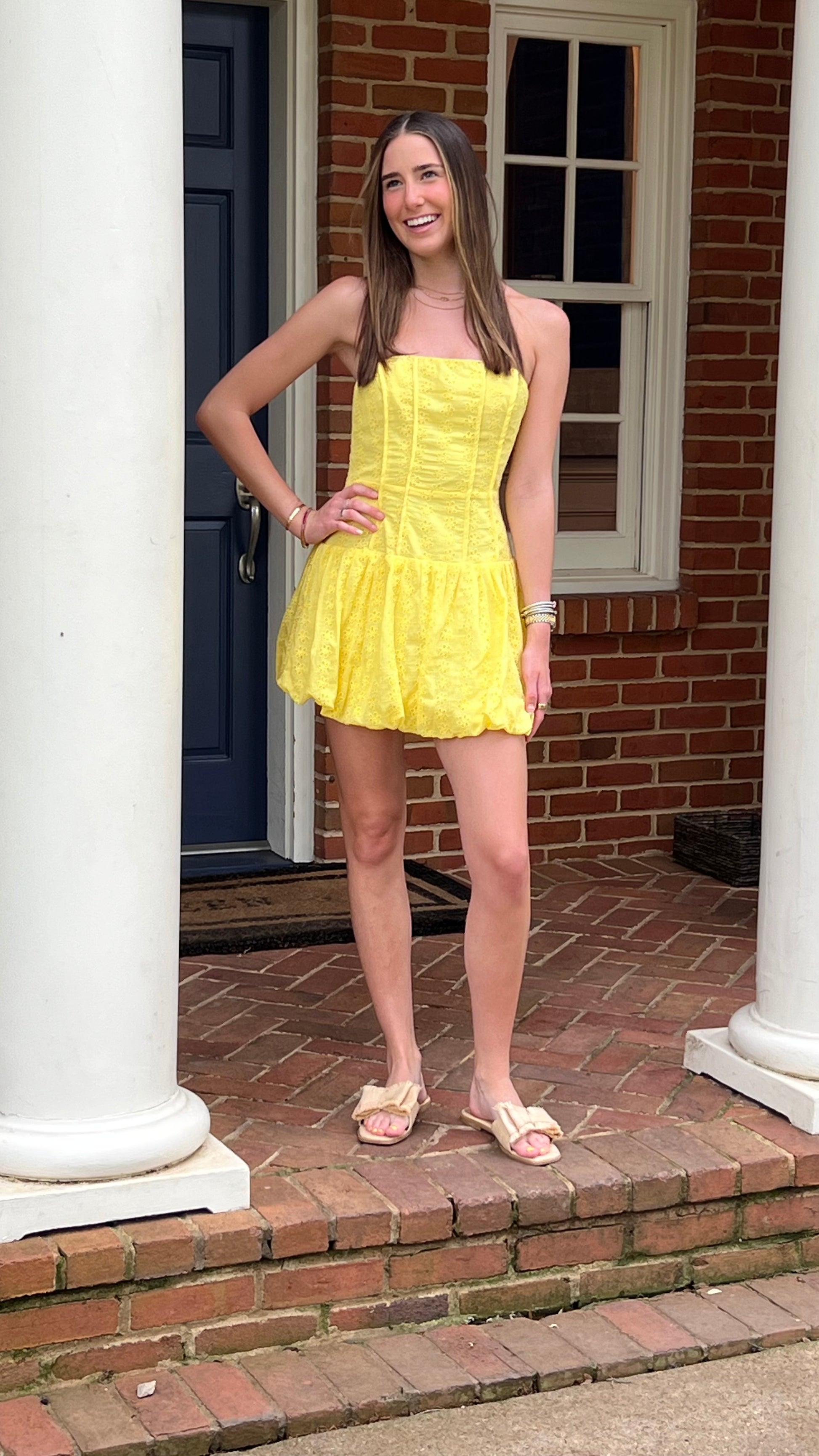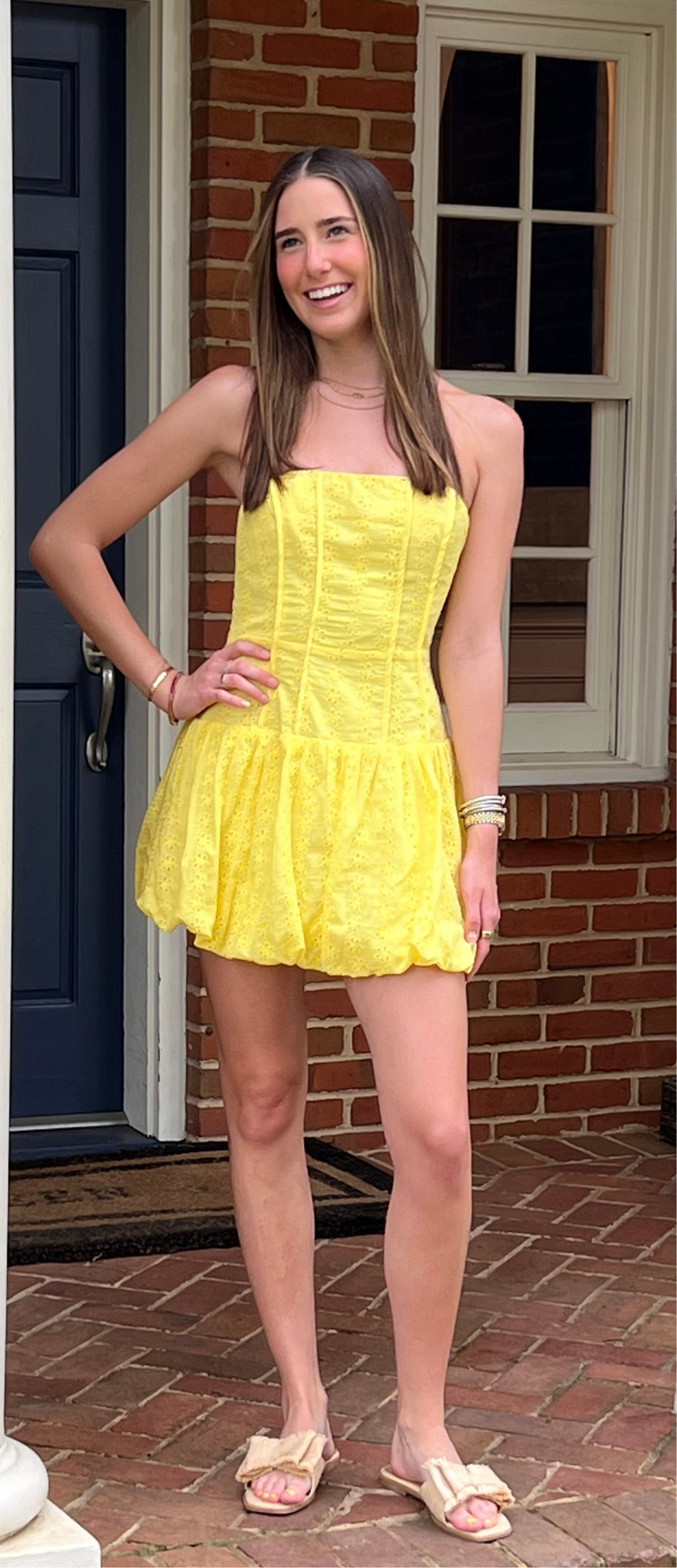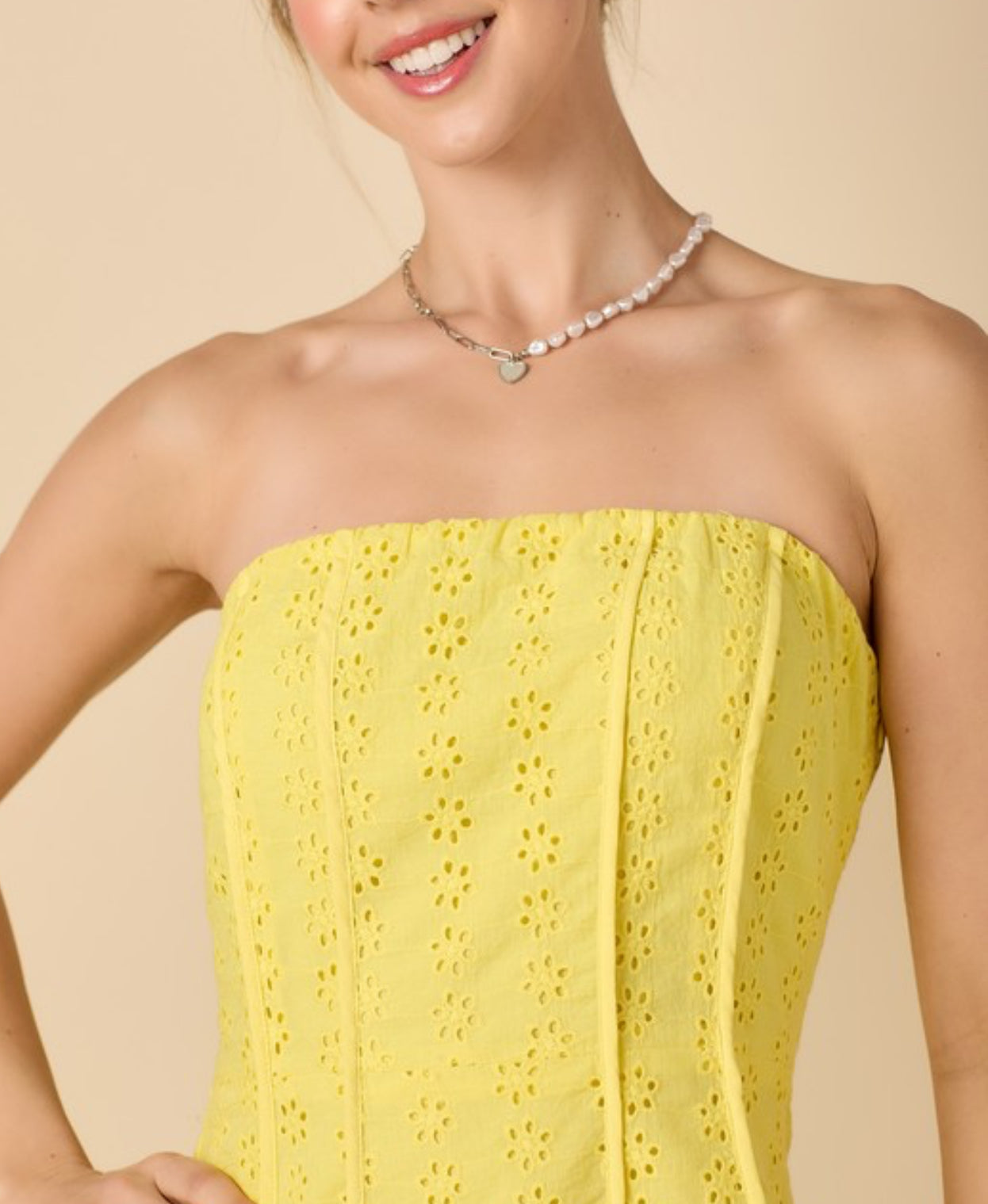 This strapless yellow mini dress features delicate eyelet embroidery, a flattering fitted bodice, and a bubble skirt that brings just the right amount of volume. The tube style neckline keeps it modern, while the bold color is a seasonal must have. Sunny, playful, and impossible to miss.