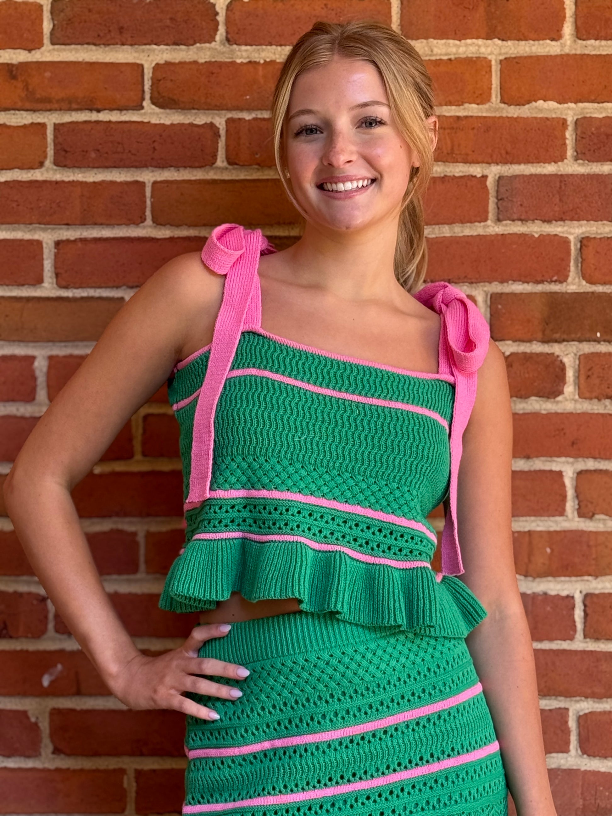 GREEN CROPPED SWEATER TANK WITH CONTRASTING STRIPES AND RUFFLE HEM by Day +Moon