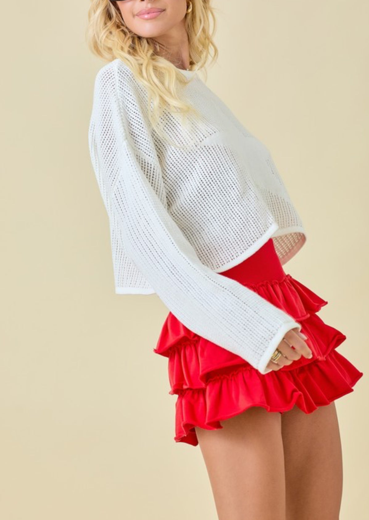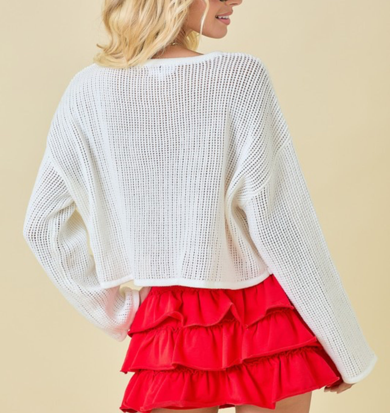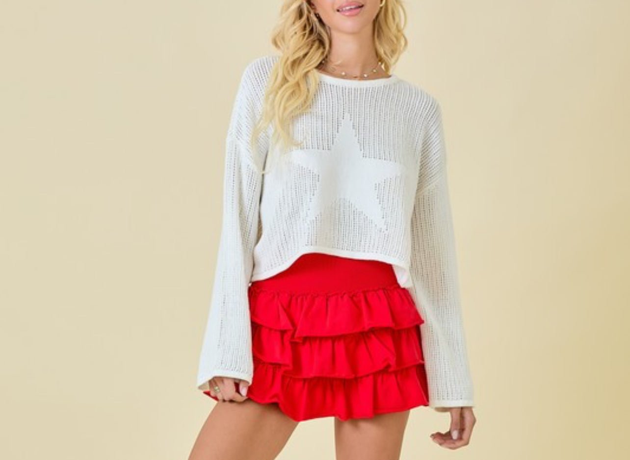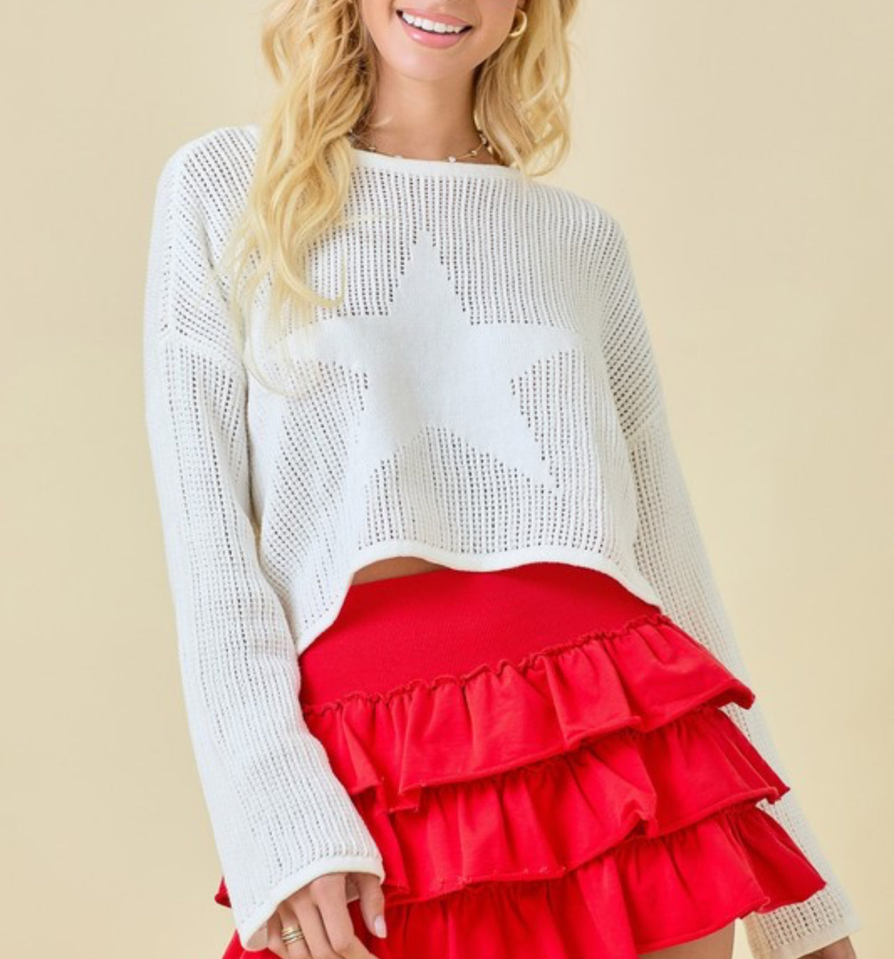 Meet the sweater that brings star power to your wardrobe literally. The Star Open Knit Sweater features a soft, lightweight knit in bright white with a tonal star detail across the front. It’s airy enough for warm weather layering and cozy enough for cooler nights.