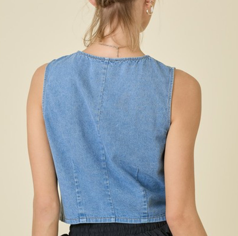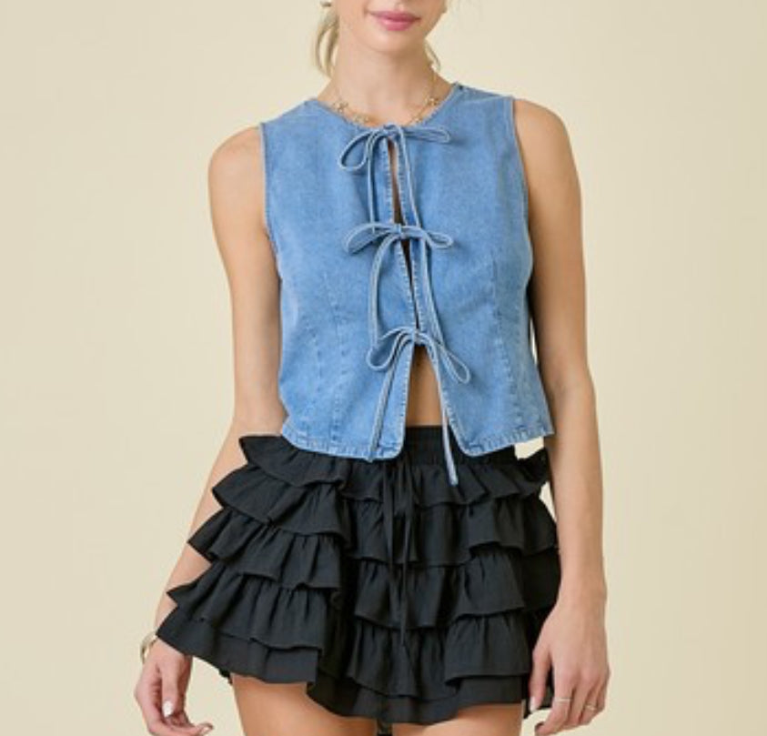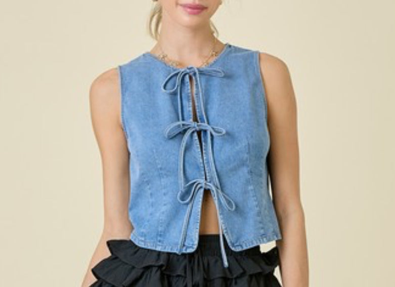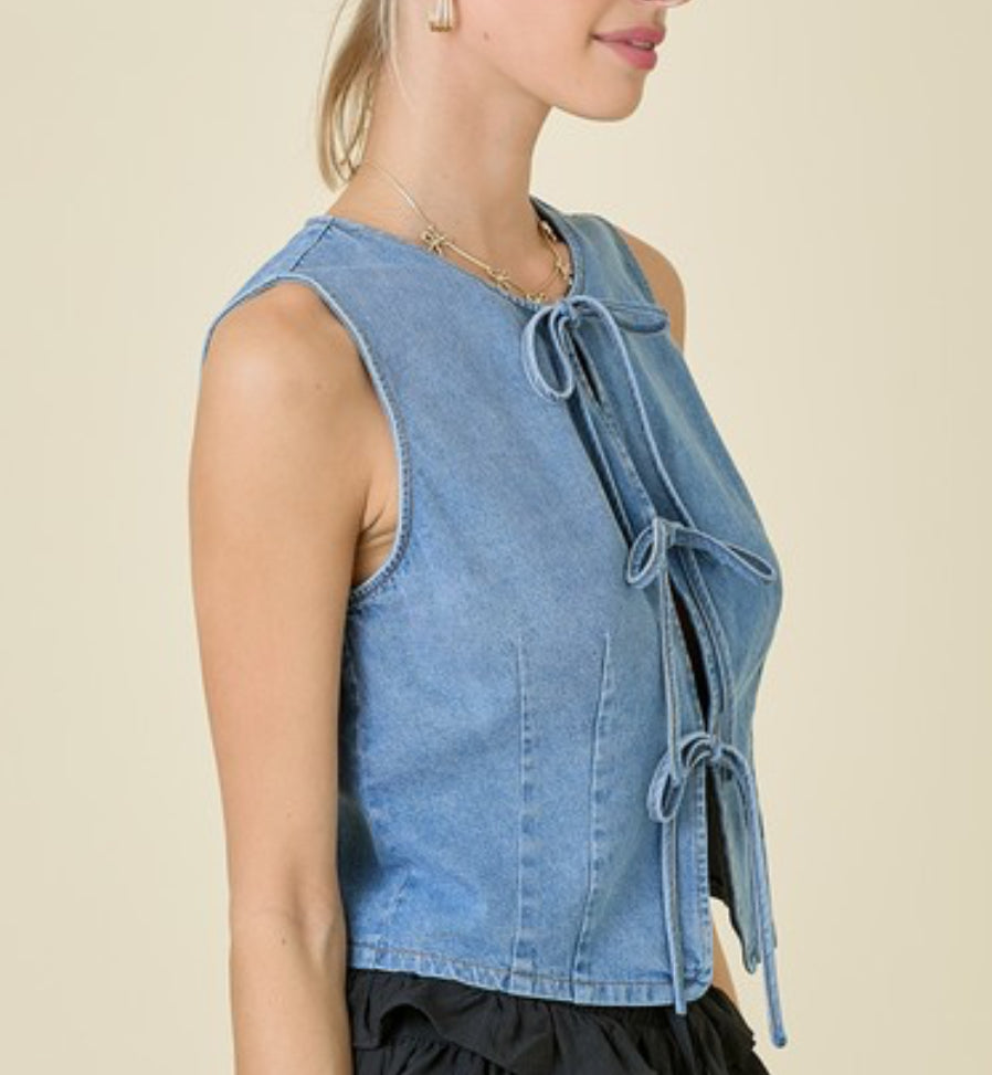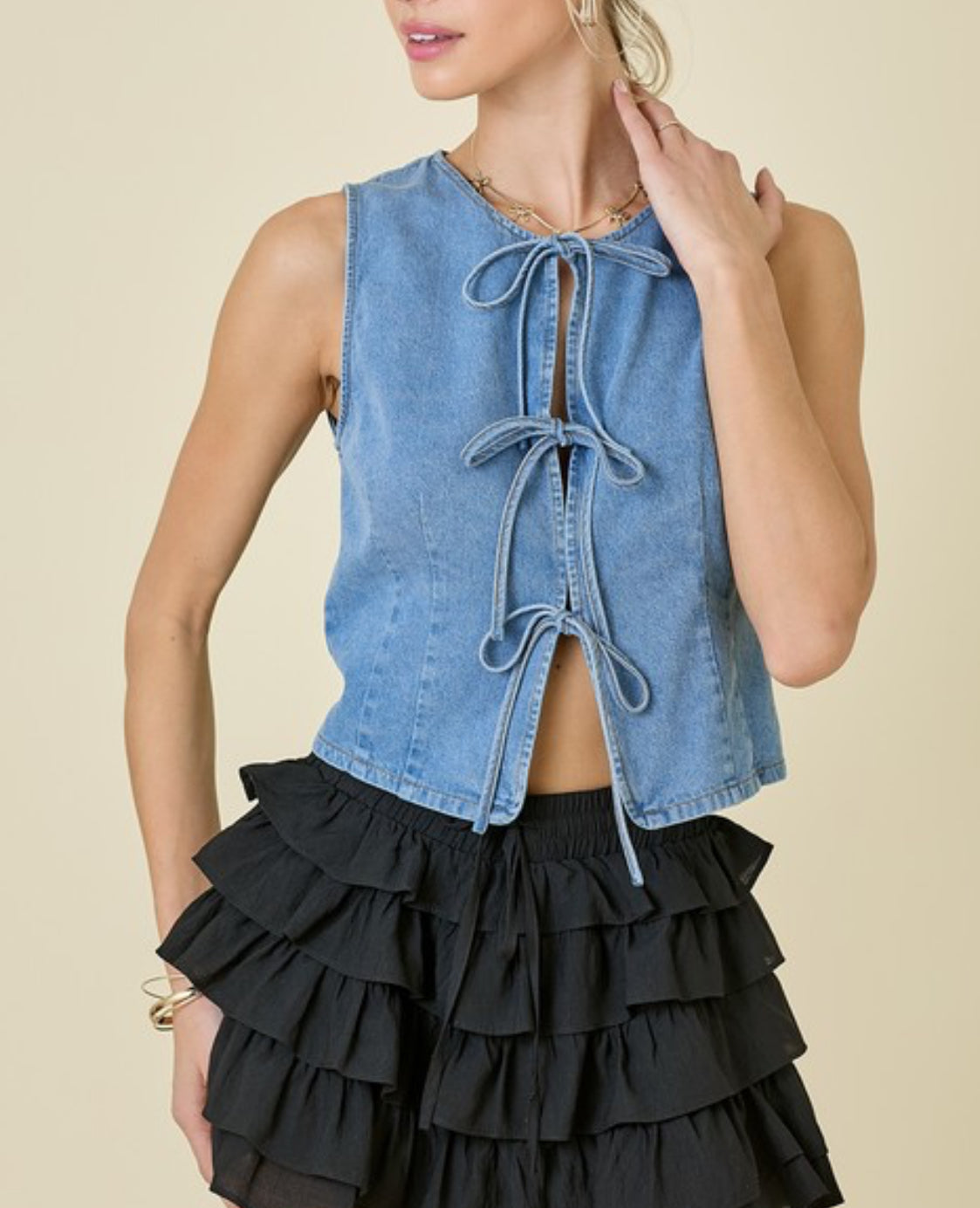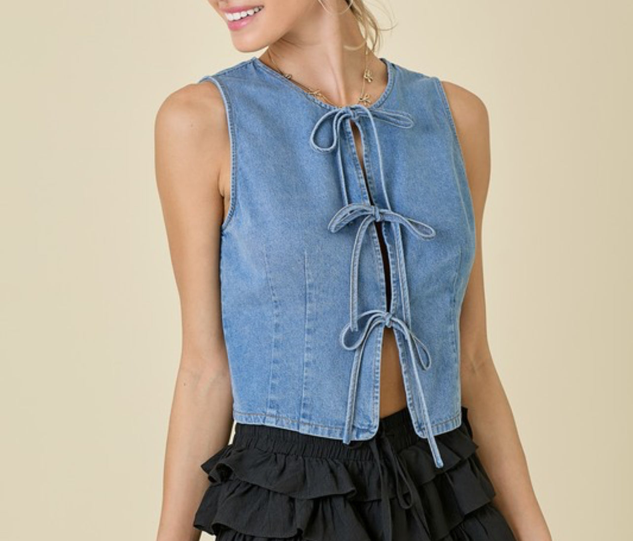 A playful twist on classic denim. This sleeveless vest by Day + Moon features three delicate front ties and a flattering open front silhouette. The structured denim gives it a polished feel, while the bow details keep things fun and feminine. Pair it with ruffle skirts or denim-on-denim for an effortlessly cool summer look.