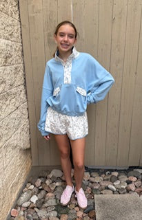 Dusty Blue French Terry with Ditsy Flower Print Semi Button Up Top by Peach Love