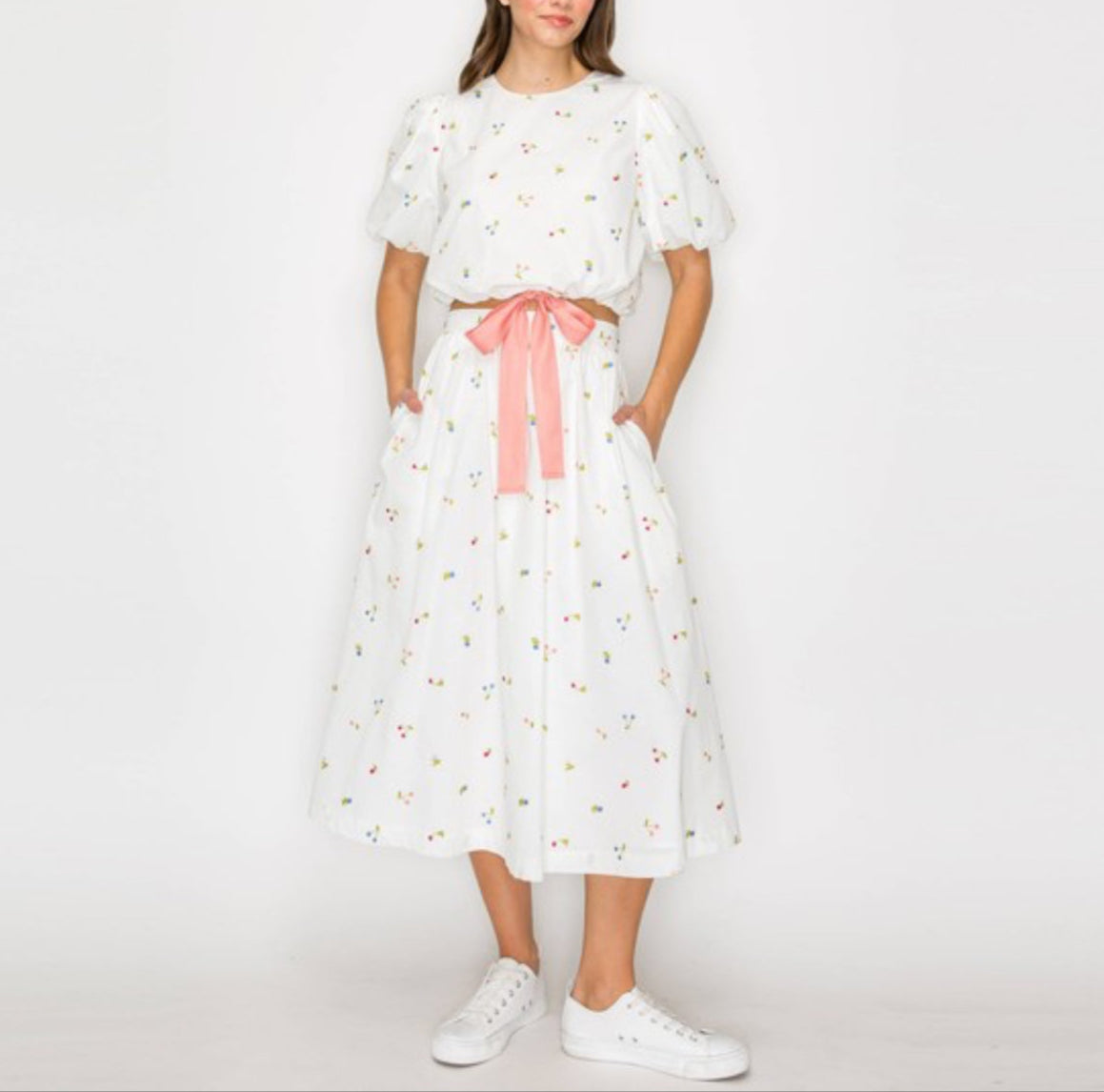 This embroidered cotton full skirt features a flattering high waist, flowy silhouette, and delicate floral stitching throughout. It’s fully lined with just the right amount of fullness for movement. Pair it with a tank, tee, or the matching embroidered top (sold separately) for a charming set you’ll reach for all season long.