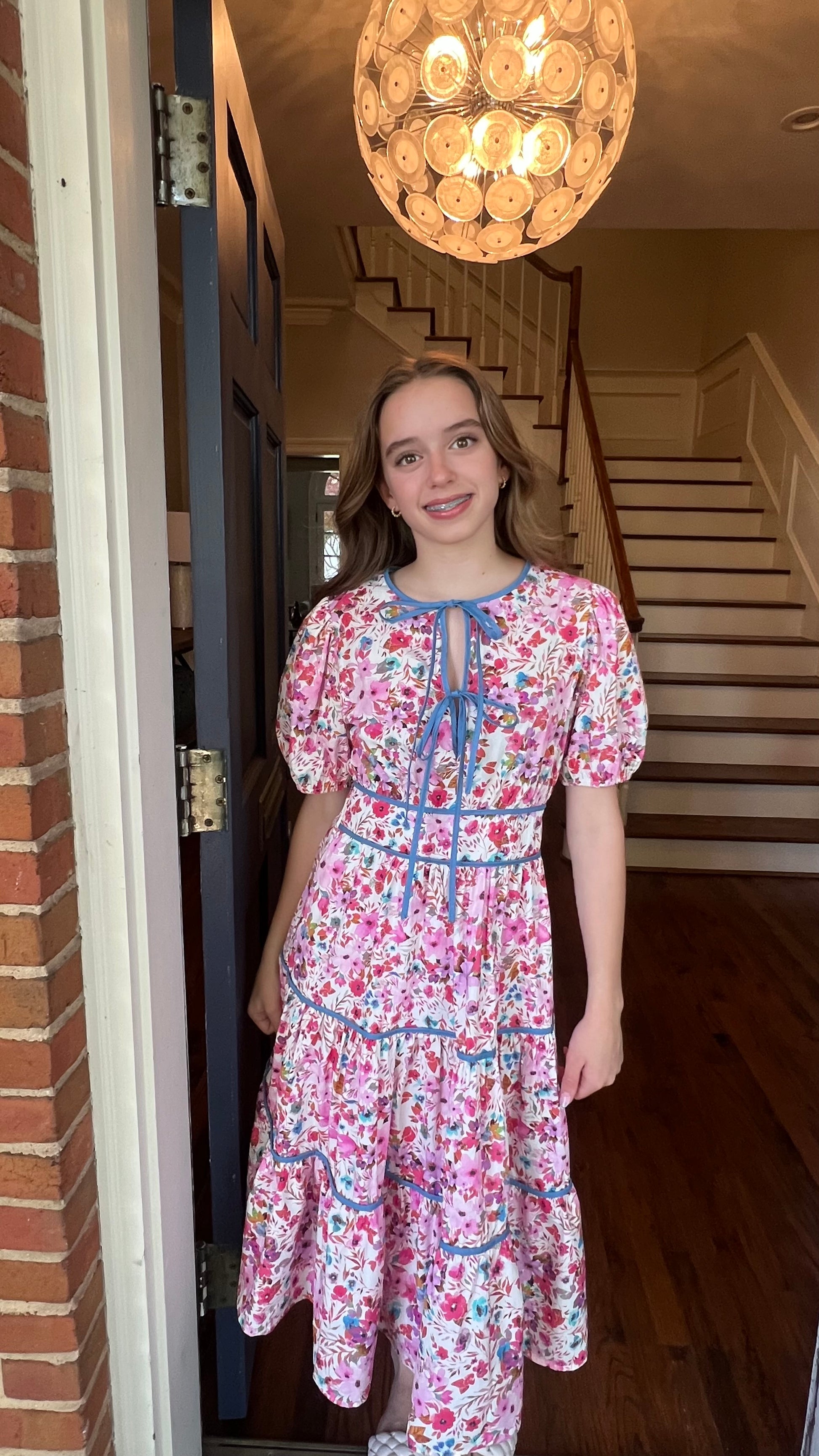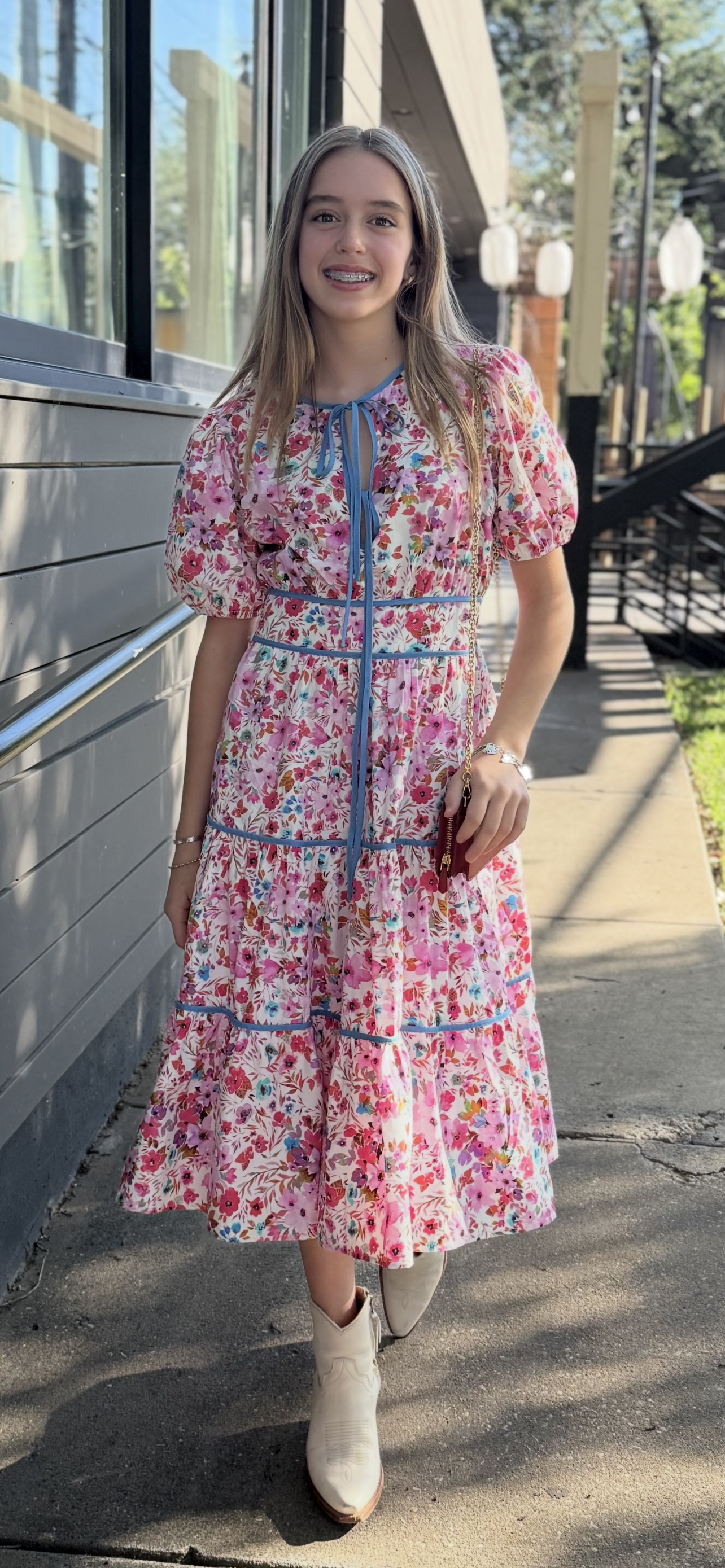 This floral midi dress features a beautiful allover print with tiered ruffle layers, a flattering waist seam, and short puff sleeves. The contrasting trim adds just the right pop of color and polish. Perfect for parties, church, showers, or sunny days when you just want to feel pretty.