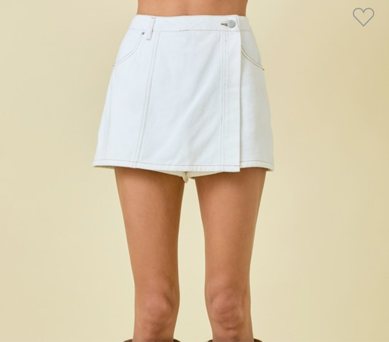 A stylish asymmetrical skort with a front wrap design. Available in classic denim and off white. Comfortable and versatile.The wrap front gives it a modern edge, while the soft denim fabric keeps it easy to wear. Pair it with anything this one’s a closet chameleon.