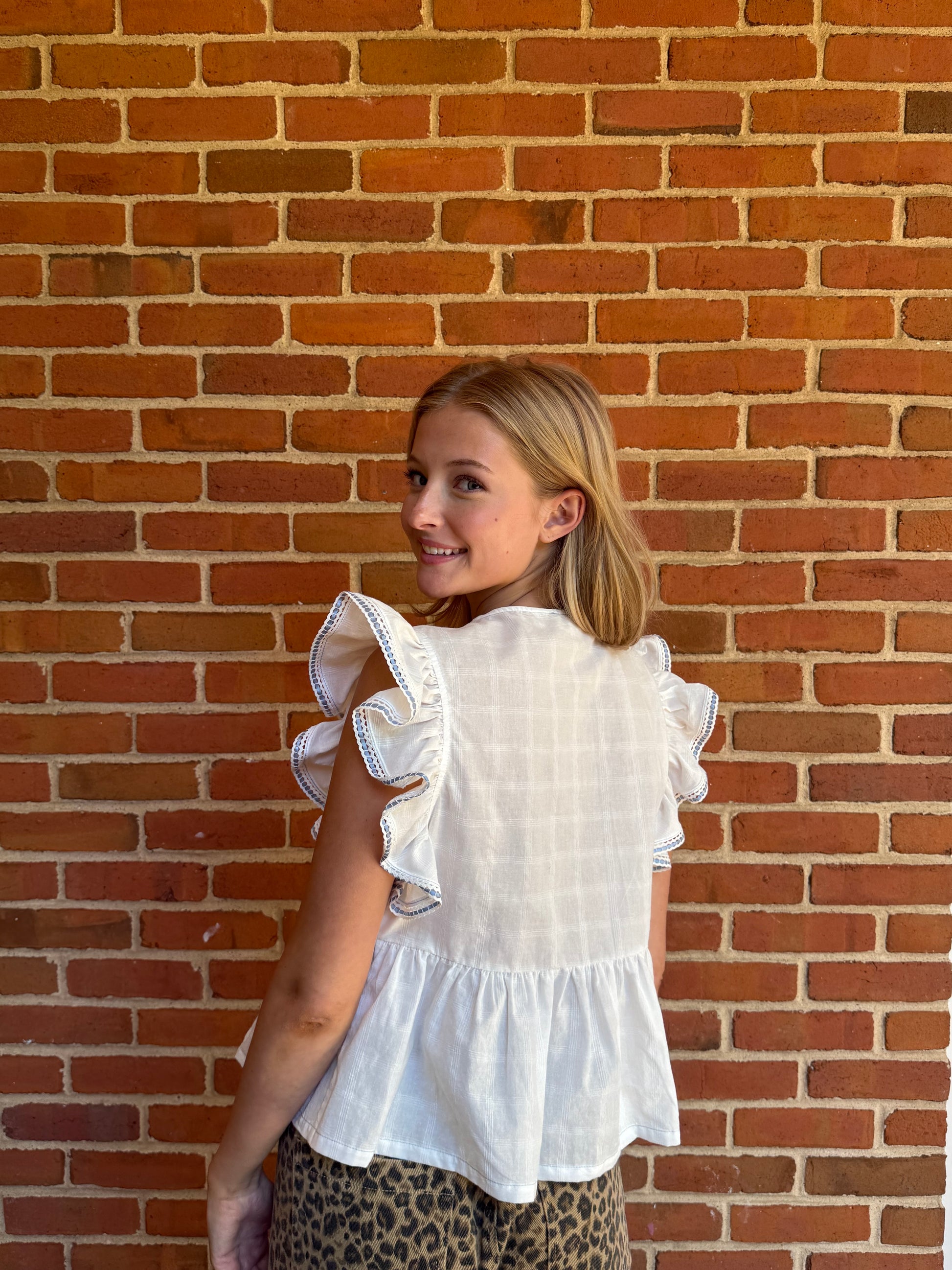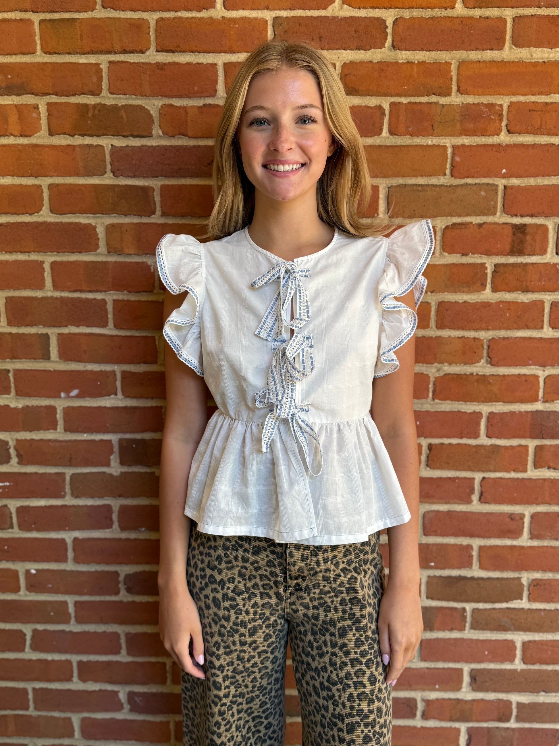Soft, sweet, and full of charm. This white cotton jacquard top features flutter sleeves, lace trim, and a dainty front tie detail that makes it feel extra special. Lightweight and breezy, it pairs perfectly with denim, skirts, or flowy shorts. Dress it up or down it’s a total wardrobe sweetheart.