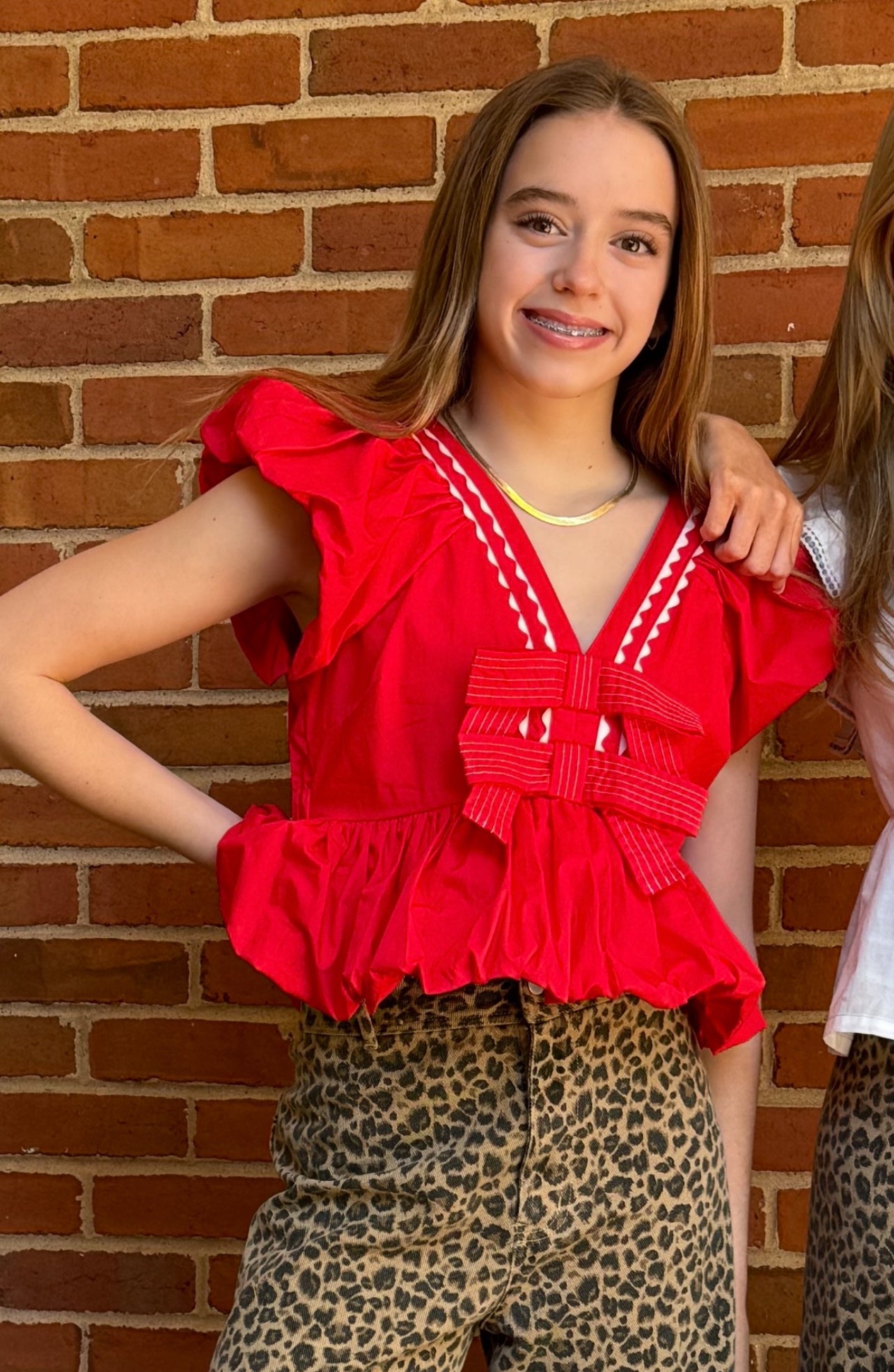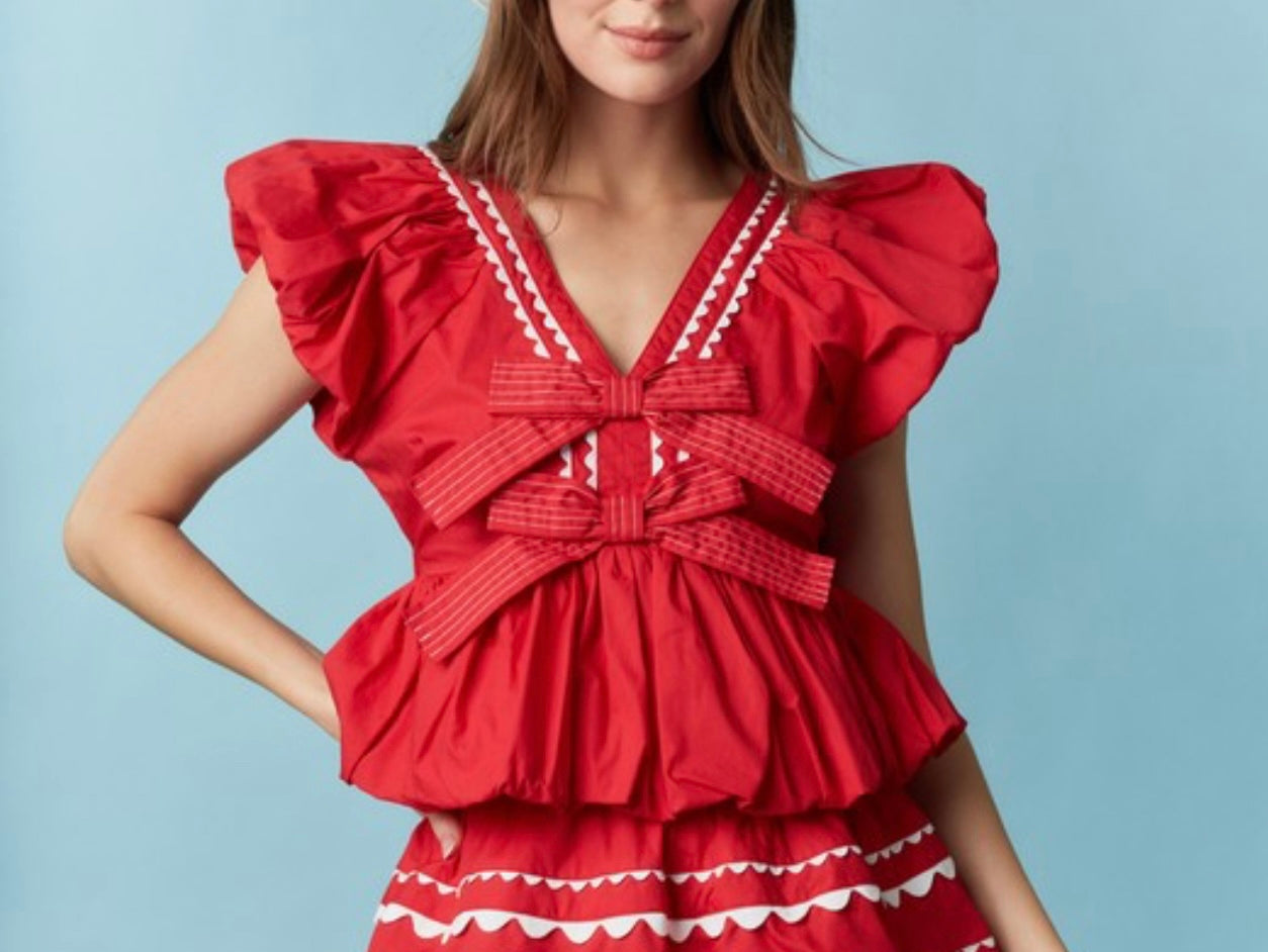 All the charm, all the drama. This red cotton poplin top brings the fun with contrast ric rac trim, a bubble hem, and bow details. The ruffled sleeves and structured shape make it a standout on its own. Style it with denim shorts, white jeans, or a flouncy skirt for a bold summer look that turns heads.