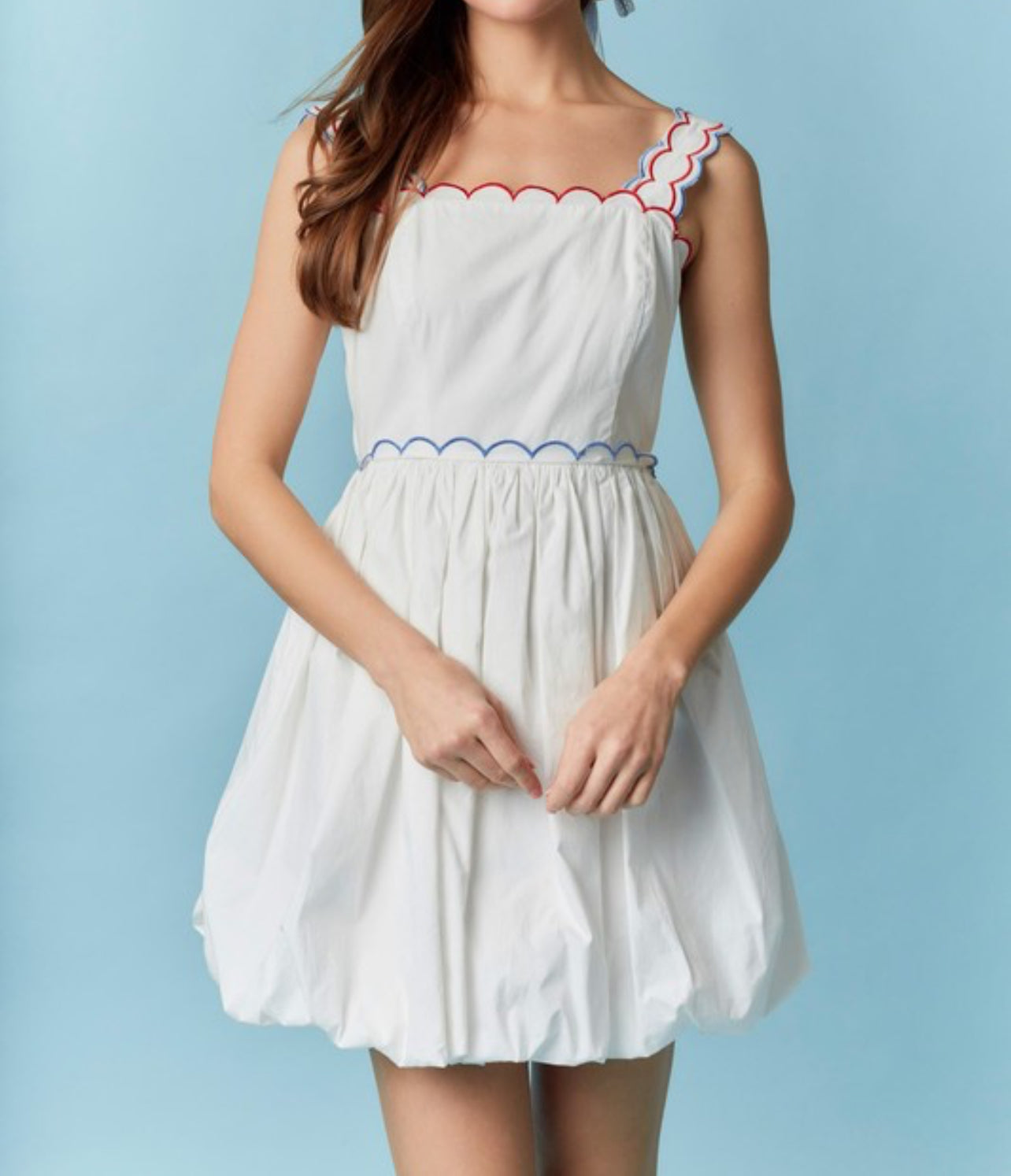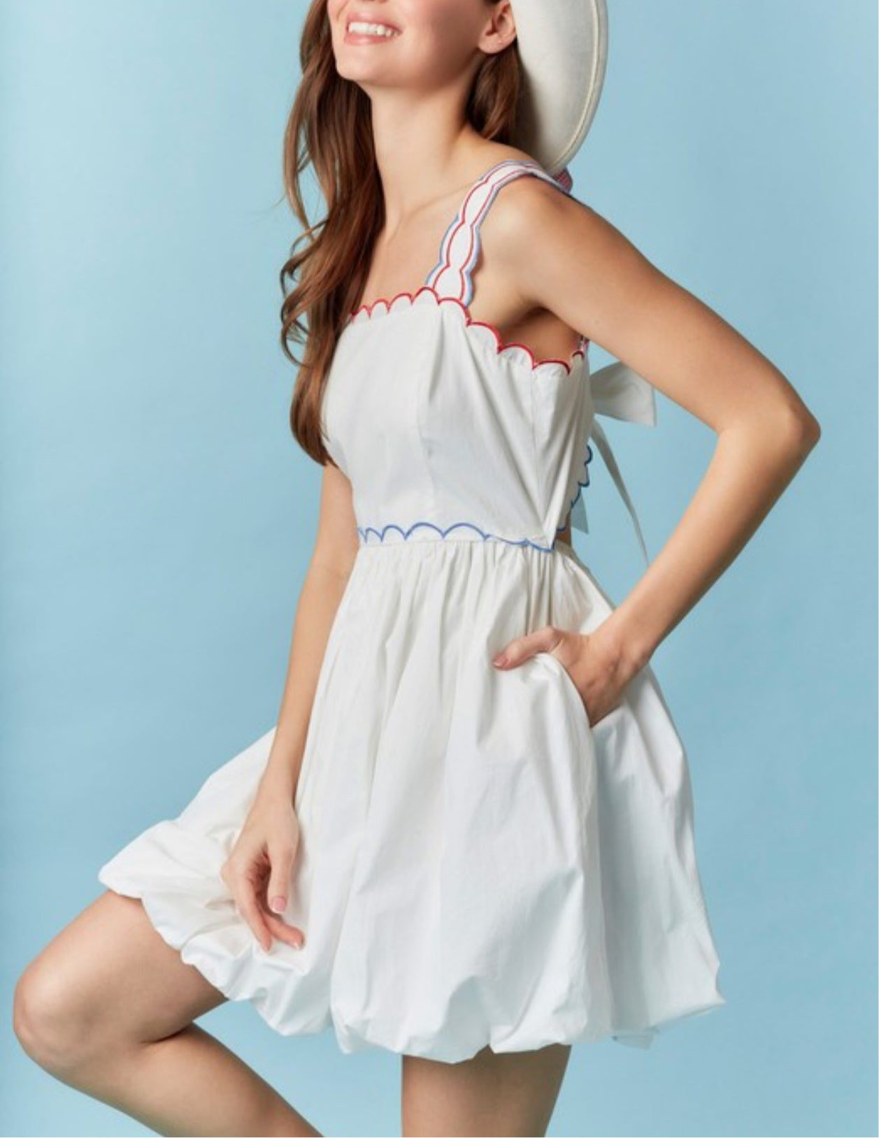 The ultimate summer dress. This cotton poplin mini features colorful scalloped trim, a playful bubble hem, and a dramatic bow back that steals the show. Lightweight and breathable with an open back, it’s perfect for warm weather parties, beach days, or just feeling cute wherever you go.