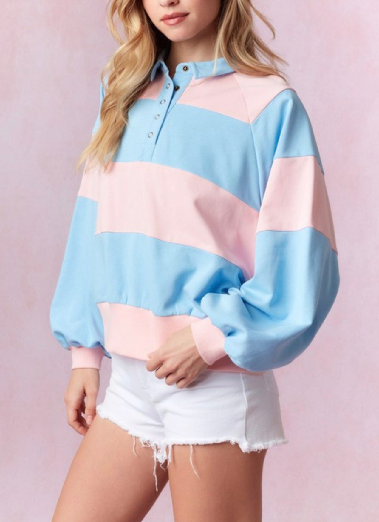 Pastel perfection with a sporty twist. This oversized snap button pullover features bold colorblock stripes in pink and blue, dropped shoulders, and a relaxed fit that makes it ideal for layering. Perfect for road trips, mountain mornings, or just keeping cozy in class or the AC. A fun twist on the classic rugby pullover.