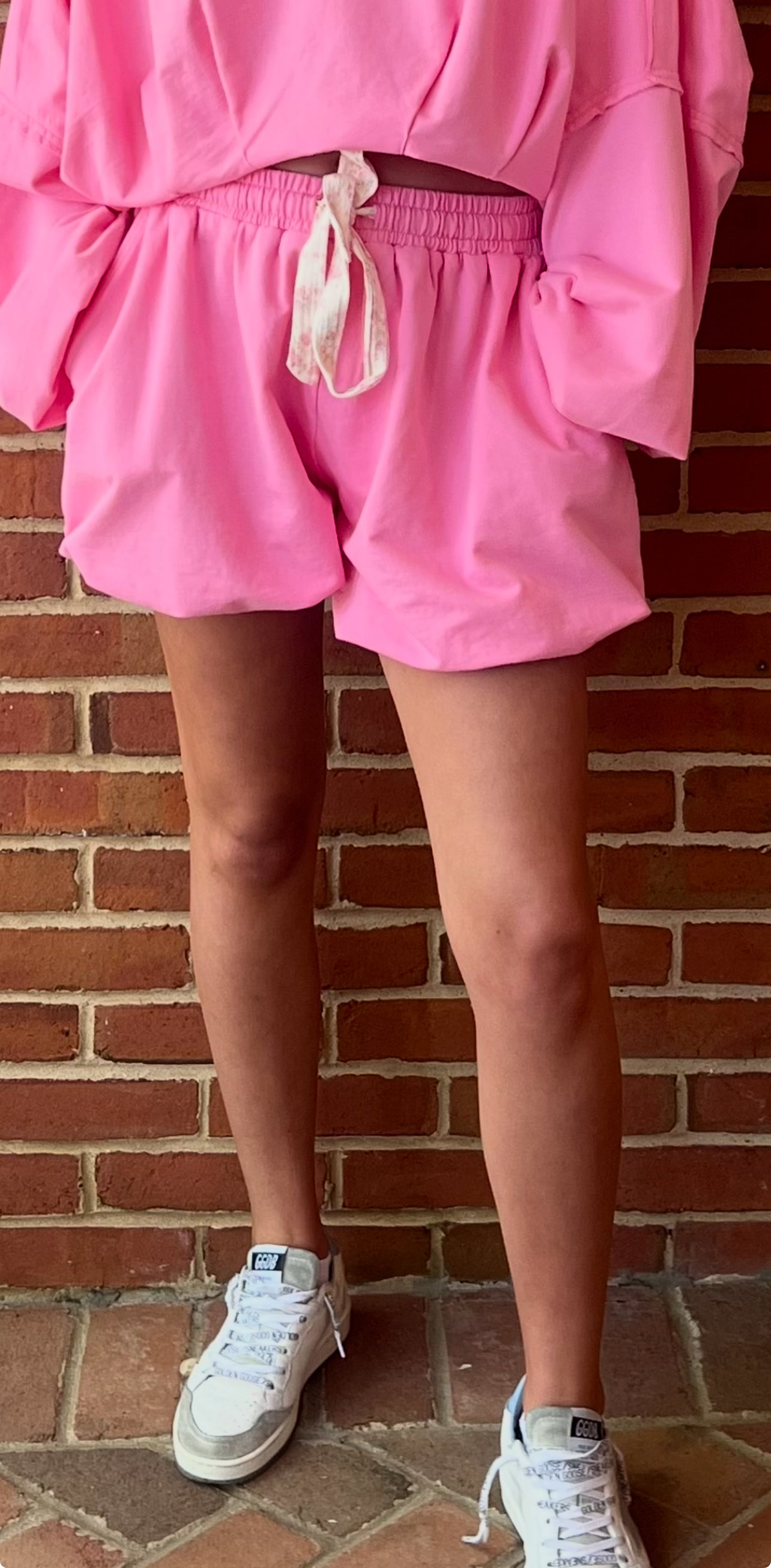 Meet your new favorite summer shorts. With a soft pink hue and subtle bubble hem, these pull on shorts are fun, flirty, and totally wearable. Pair them with the matching cropped sweatshirt for an easy travel set or style them solo with your favorite tank or tee.