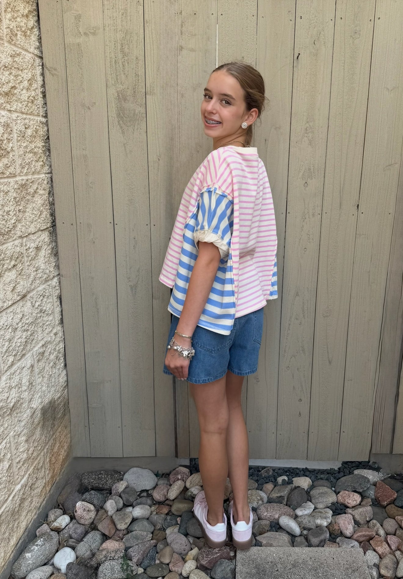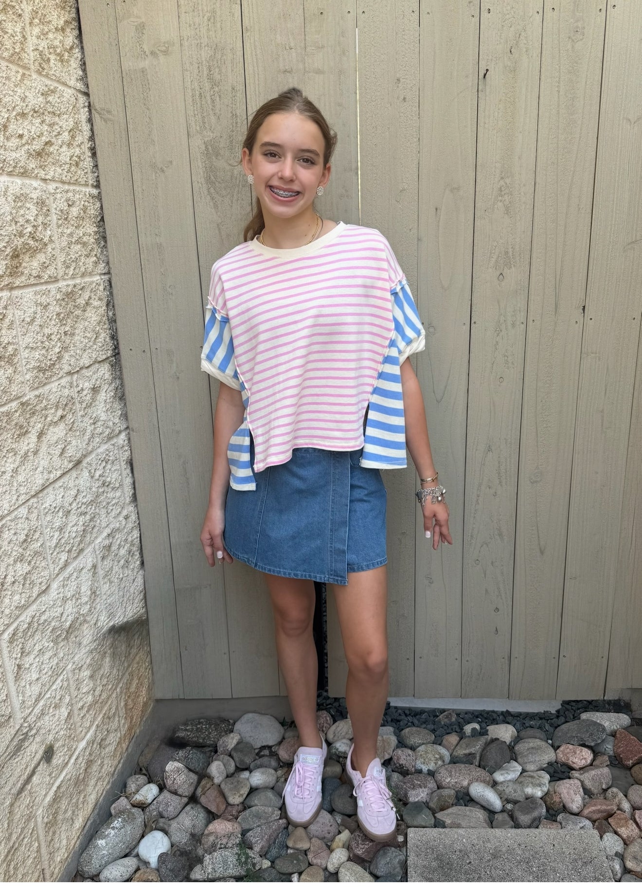 Preppy meets playful in this bold striped tee by Peach Love! With a boxy, relaxed fit and contrast color blocking in soft pink and light blue, this thick cotton tee is made for comfy cute days. The short sleeves feature wide blue stripes while the body pops with pink. This tee is perfect for back to school, weekend hangouts, or layering under your fave jacket.