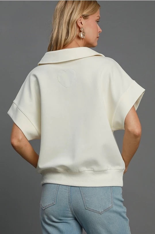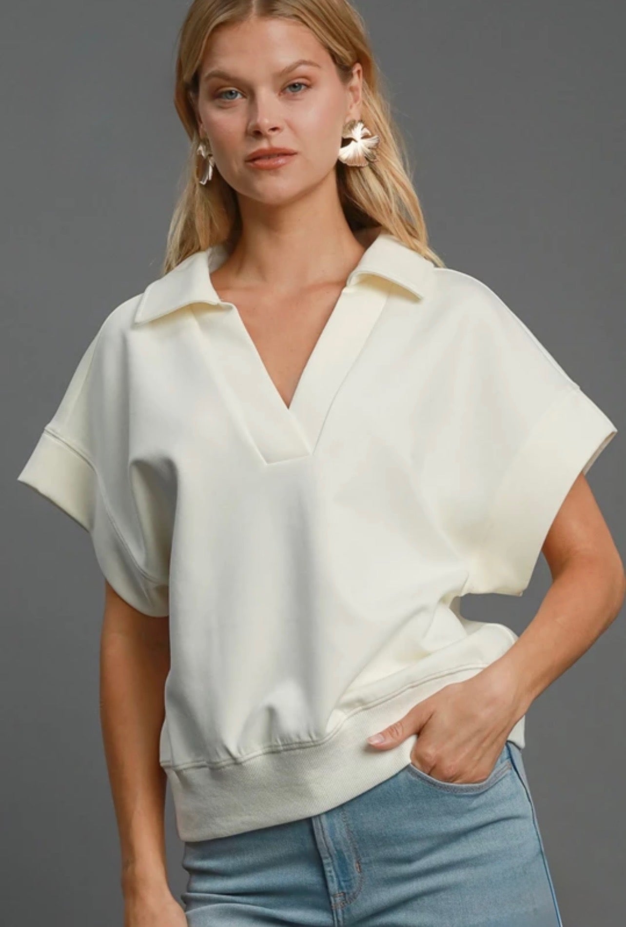 Clean, cool, and endlessly versatile. This cream short-sleeve top features a relaxed fit, soft structure, and open collar that gives it just the right amount of polish. Wear it with denim or pair it with the matching shorts for a monochrome moment that’s both effortless and elevated.