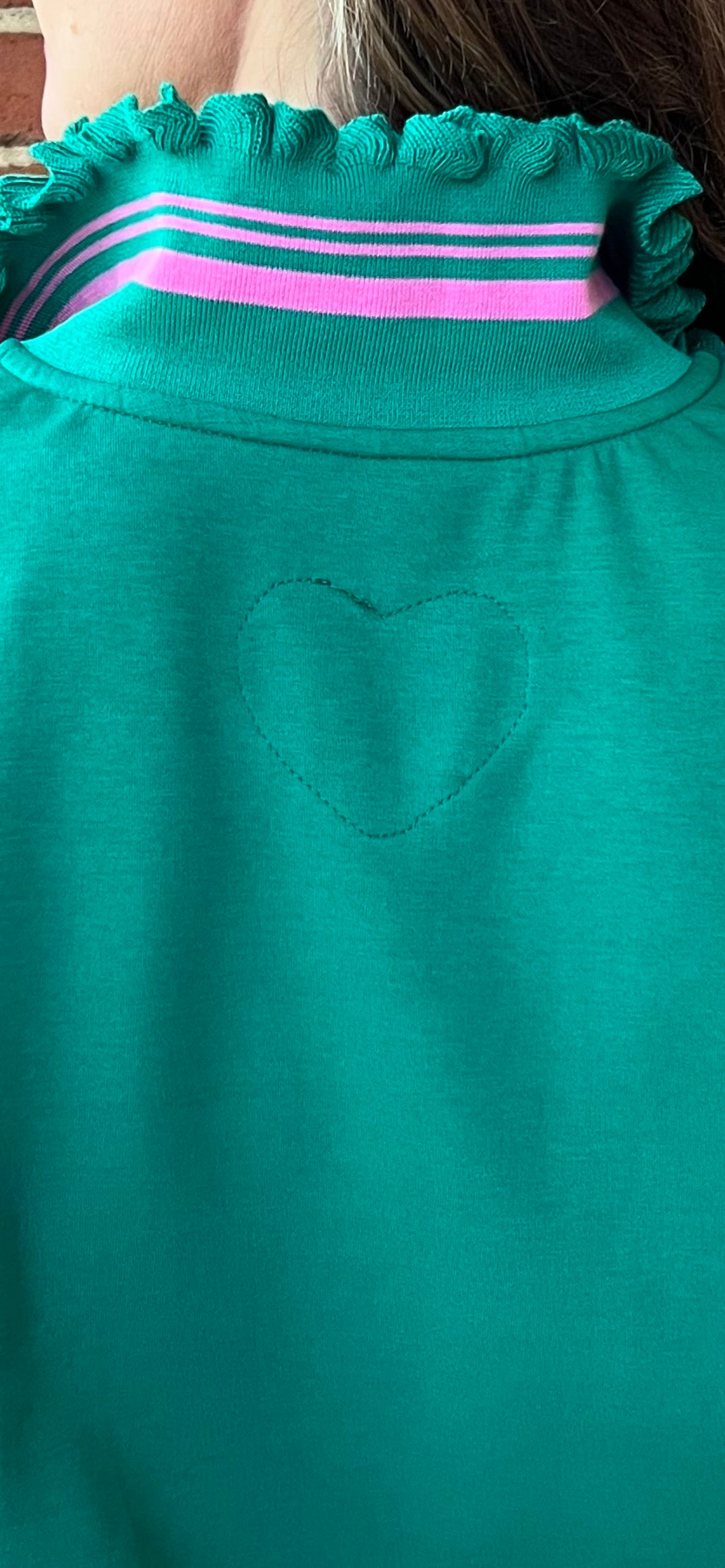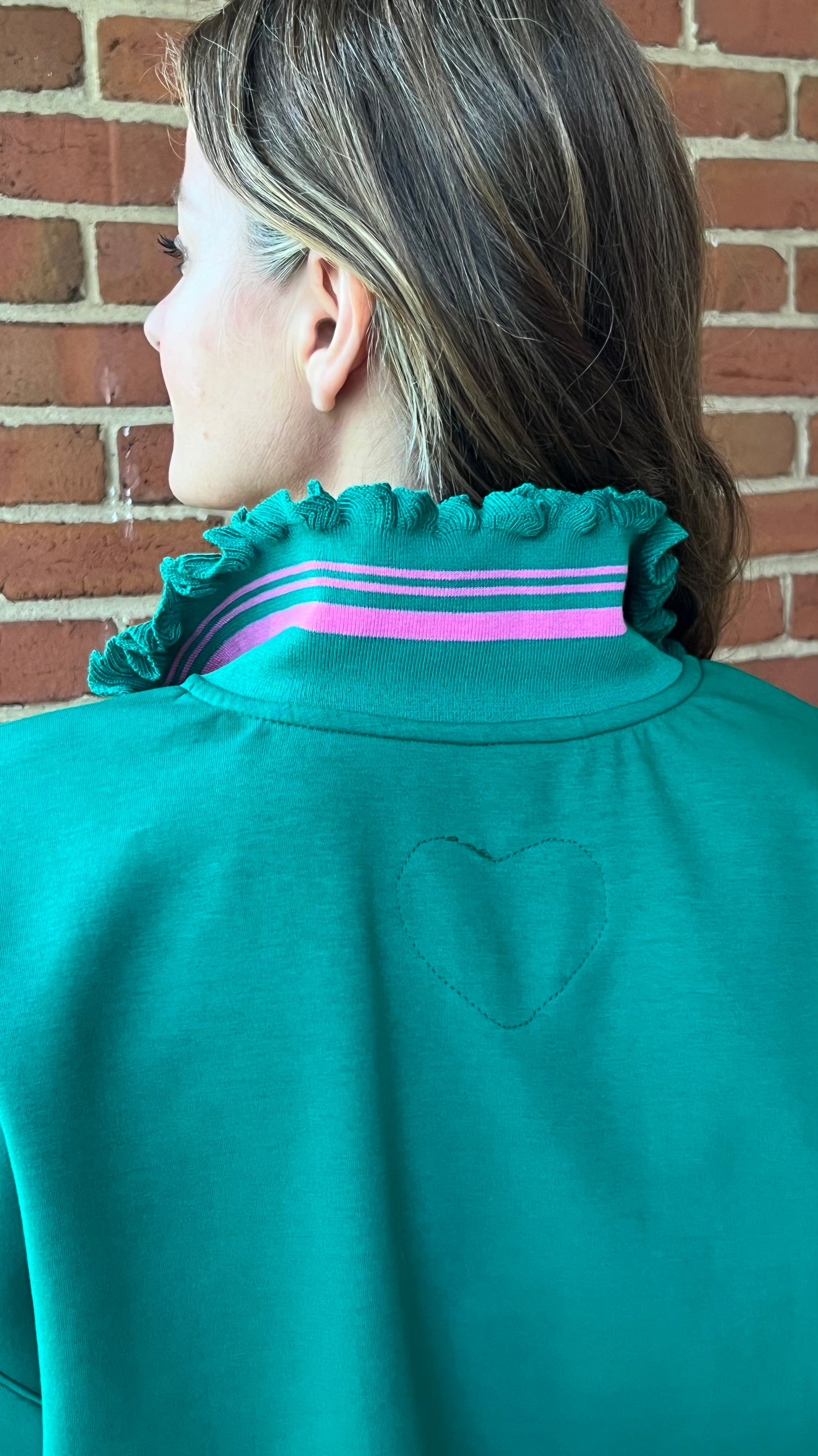 Bold, sporty, and full of personality. This kelly green half-zip top features contrast hot pink piping, a ruffle trimmed collar, and the sweetest heart detail stitched on the back. Style it with the matching short for a fun and effortless set look, or pair it with denim or white shorts for everyday wear.